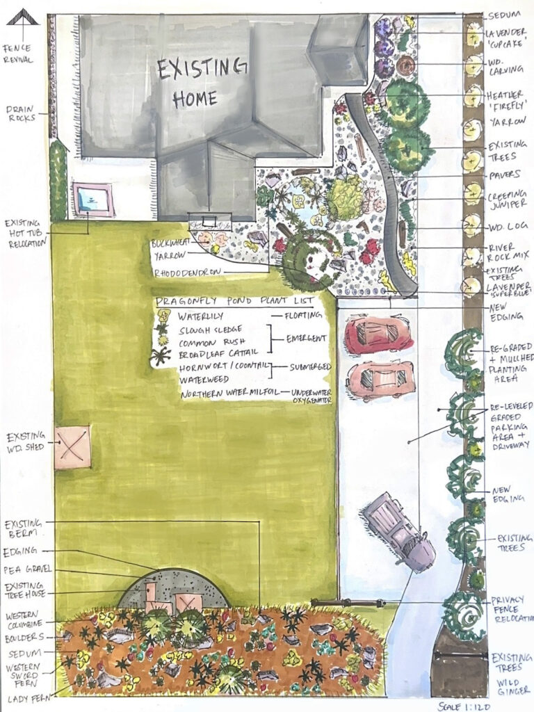 This project was created for a family who relocated to their forever home, uniquely situated along a “deer highway.” The property presented several challenges, including a high mosquito population and frequent deer traffic. To address the mosquitoes, the clients envisioned a dragonfly pond, and we designed it as an ideal habitat to naturally attract dragonflies and reduce pests.